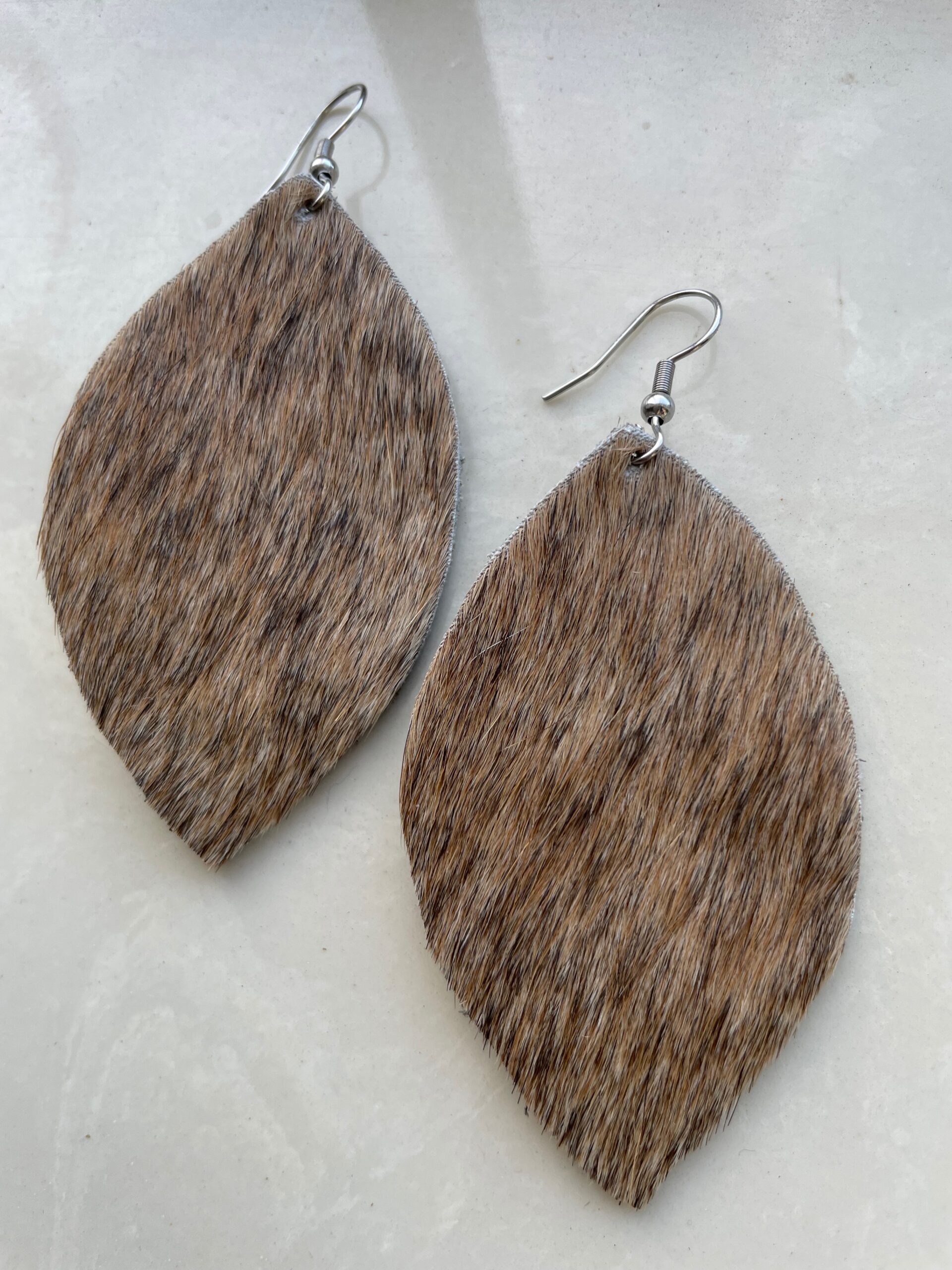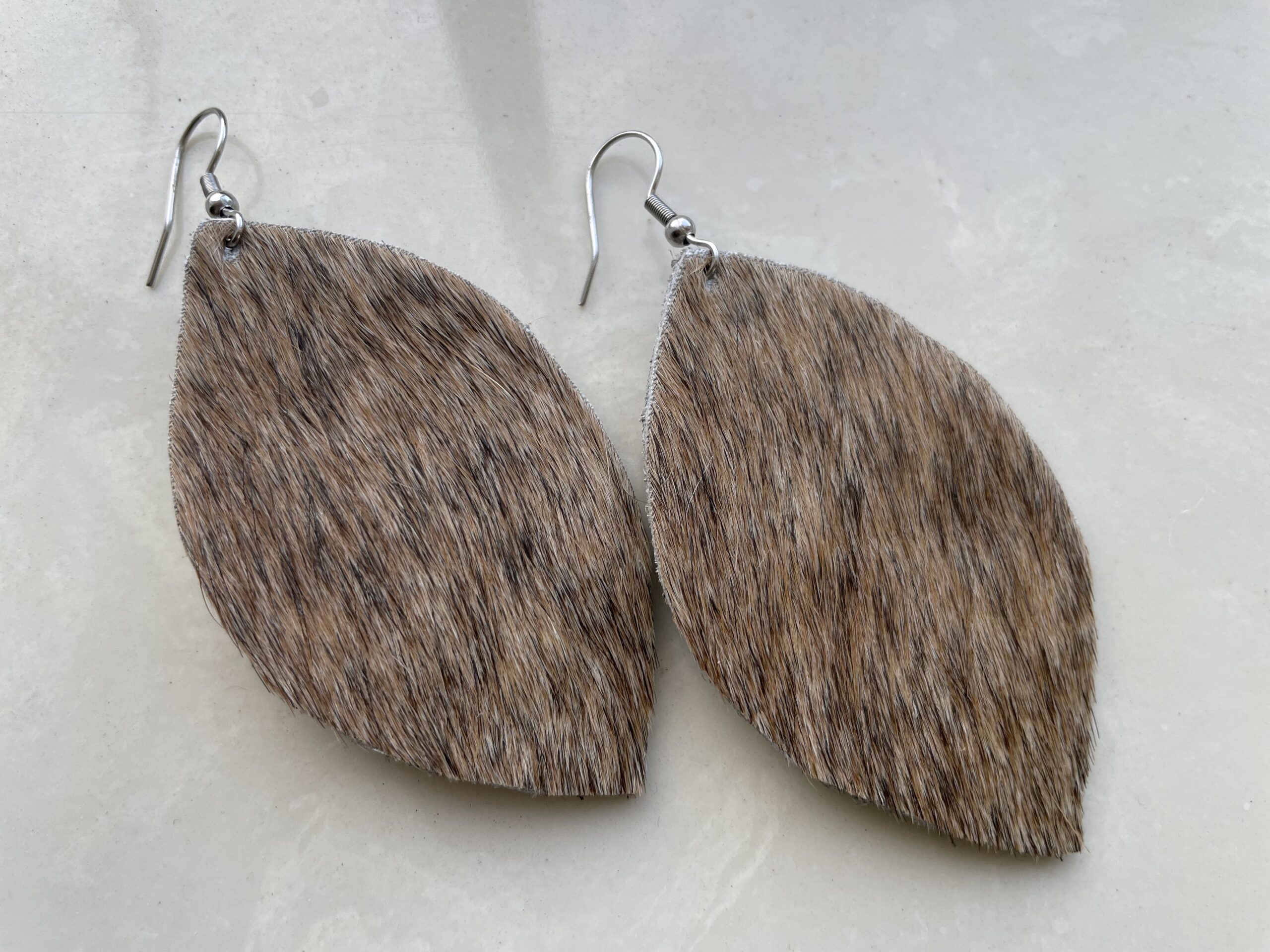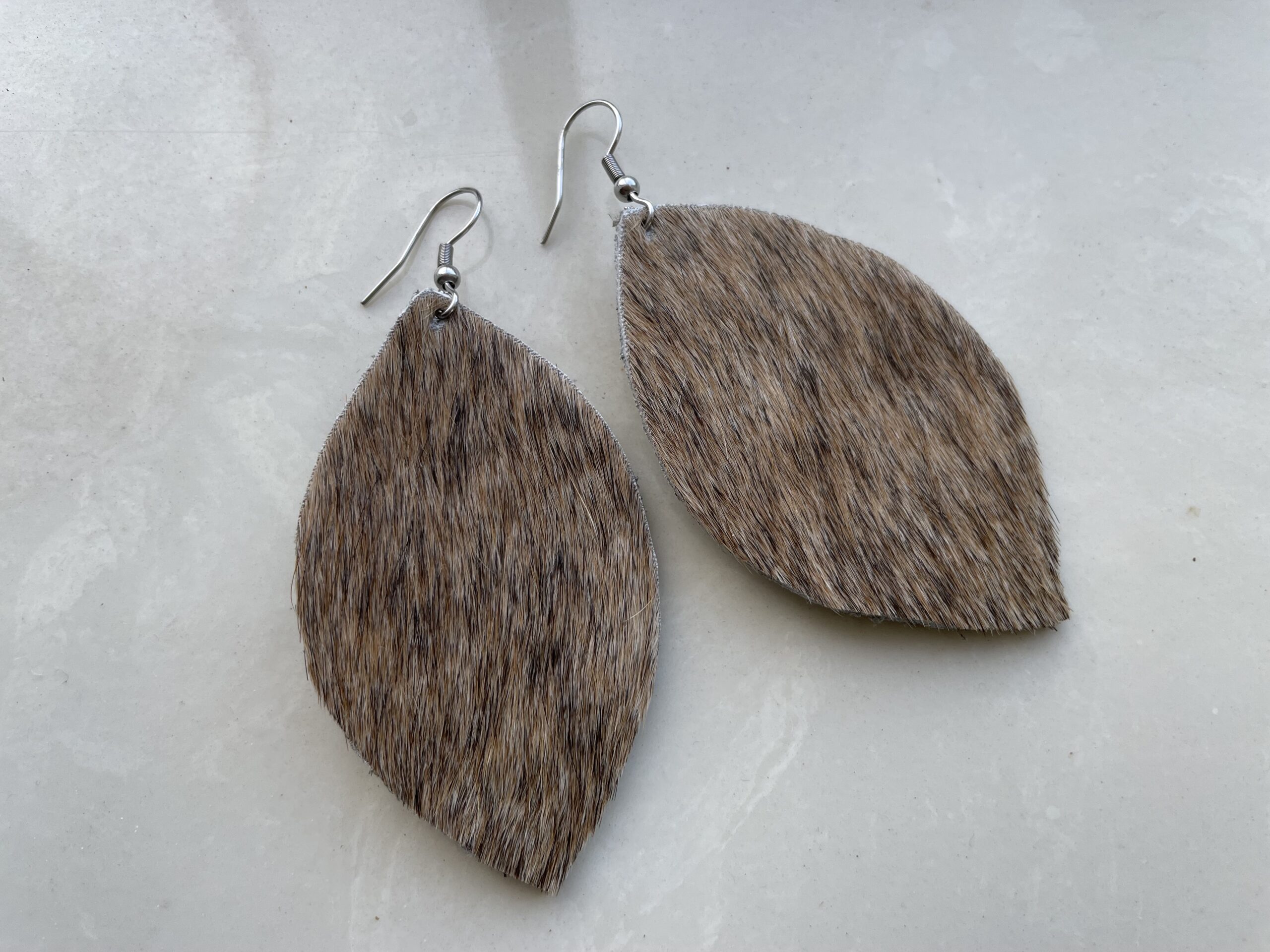 This earring set is hand-crafted from our warm and beautiful Ruth hide. Light tan undertones with blended specks of black and dark brown throughout makes these earrings irresistible to the eye. A perfect pairing with any casual outfit.